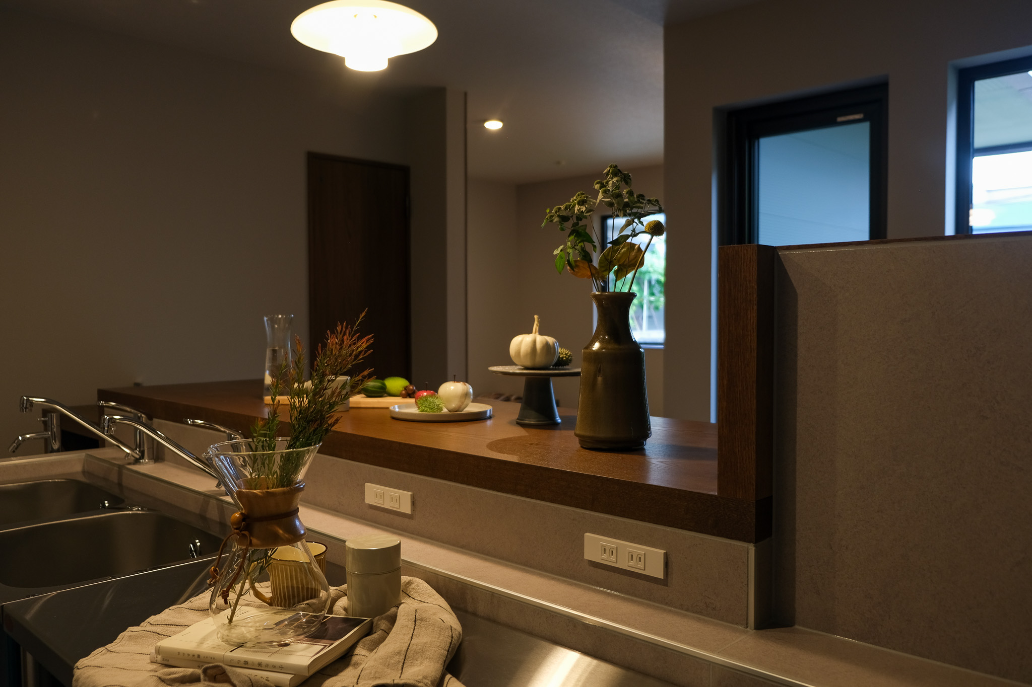 カウンターには突板を使用し、使い込むほどに味わいが増していく素材選びもポイントです。