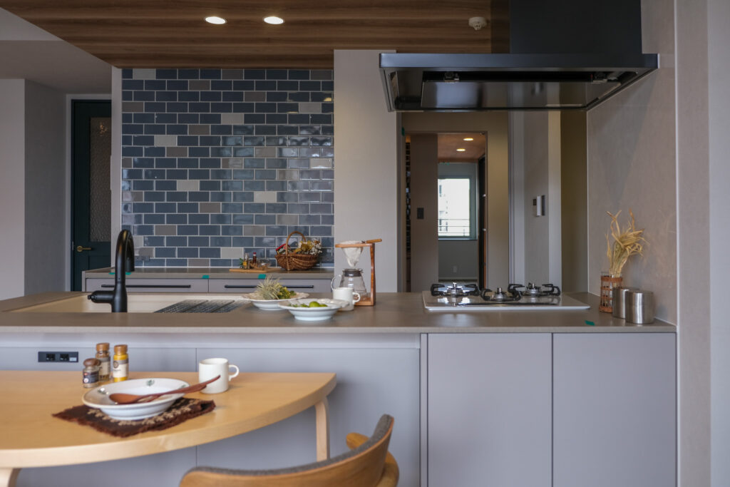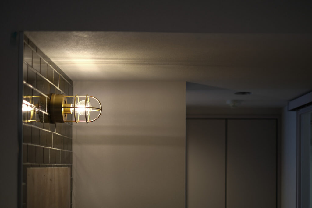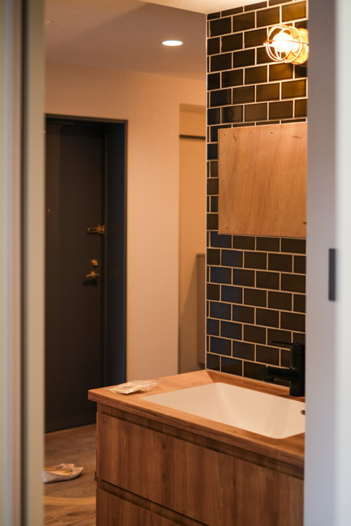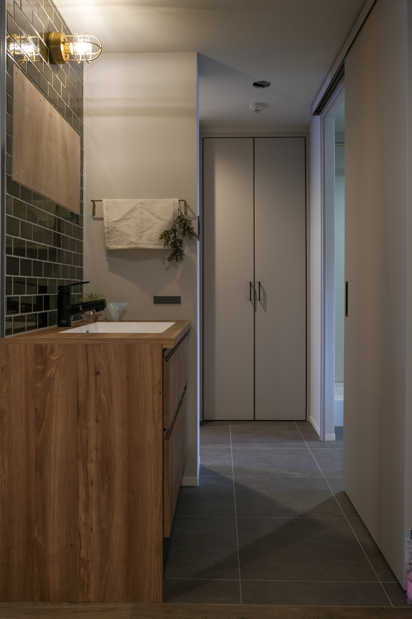 カップボードやキッチン背面のタイルなどキッチン空間のカラーは明るくナチュラルな雰囲気に、一方で床材や洗面スペース、照明にはインダストリアルのかっこよさを取り入れています。