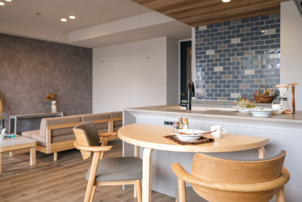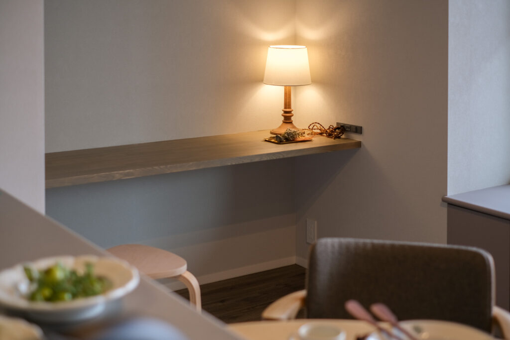 ダイニングスペース/キッチンの壁をなくし、開放感のある空間に。造作カウンターデスクの横には収納も採用、読書や仕事など少し集中したいときにぴったりのスペースになりそうです。