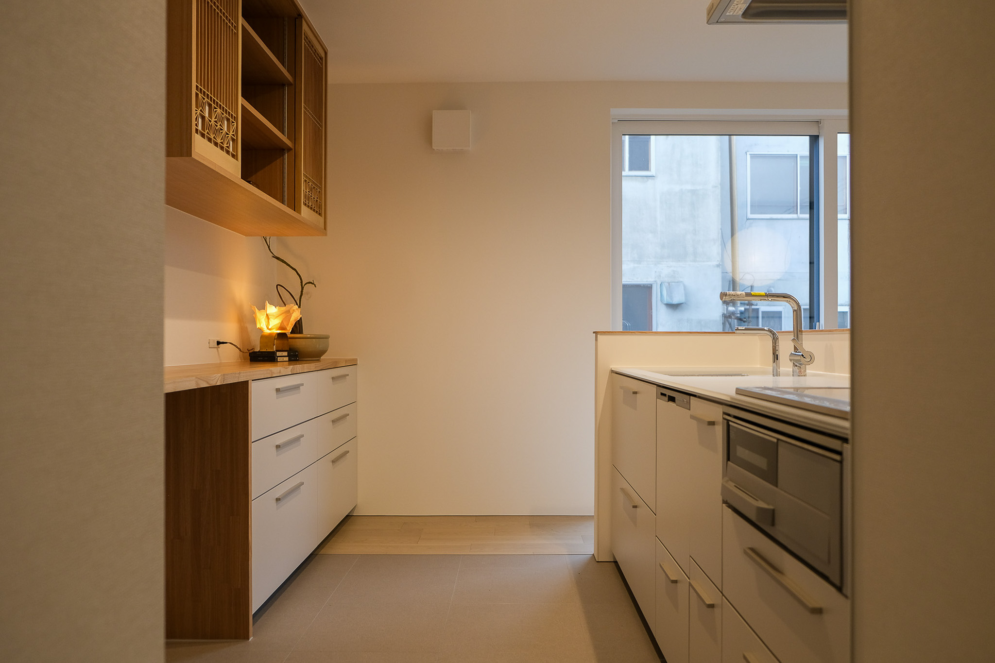 キッチンにあるカップボードなどは、どこか和の趣きを感じられるデザインに仕上げています。もともと、日当たりの良い建物で、室内には心地よい光が差し込みます。さらに、キッチンとカップボードの間にはゆとりあるスペースを確保し、動きやすさにも配慮されています。リビングの奥にはカウンター付の壁裏収納もありキャンプ用品やペット用品の収納にも困らなそう。