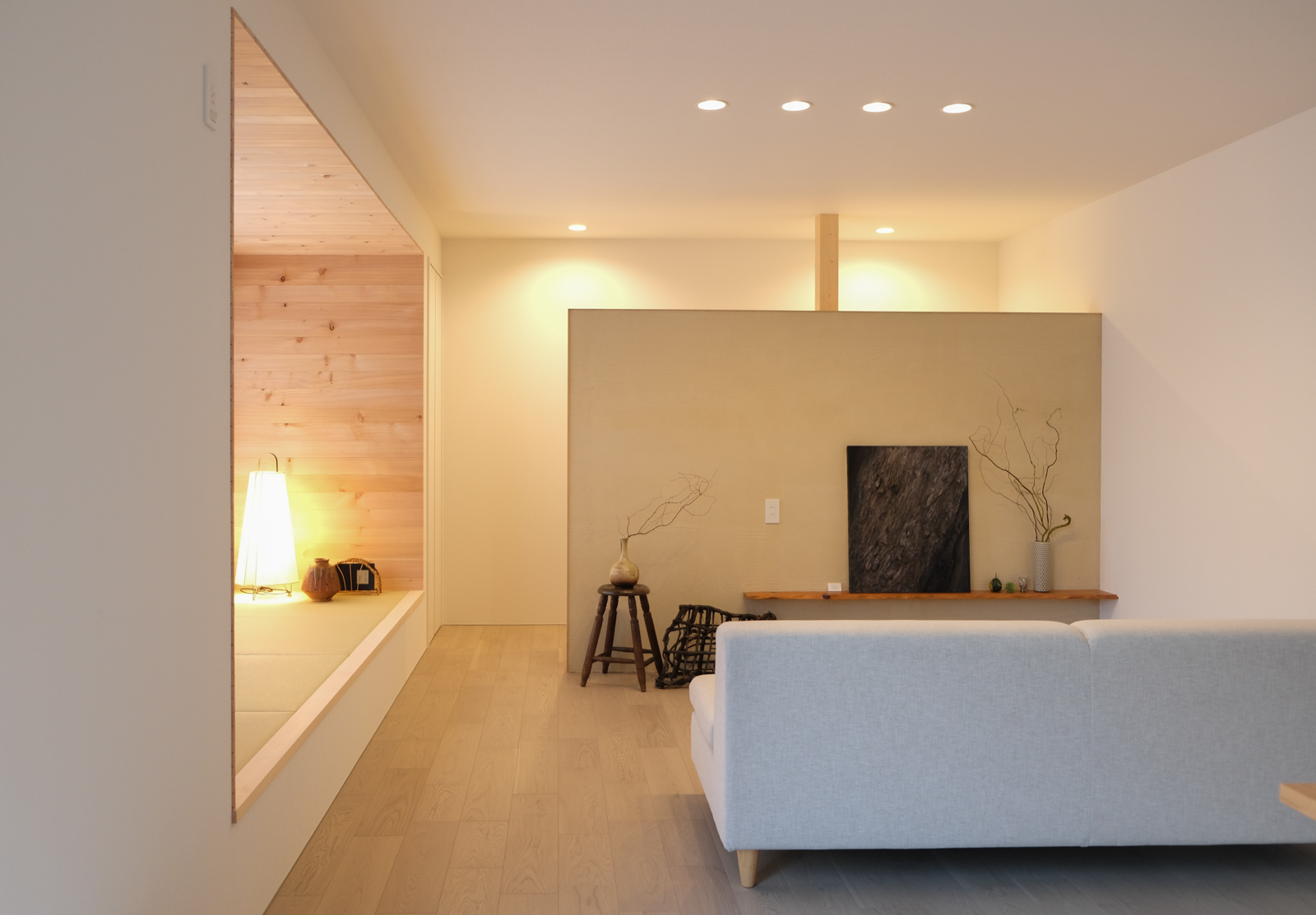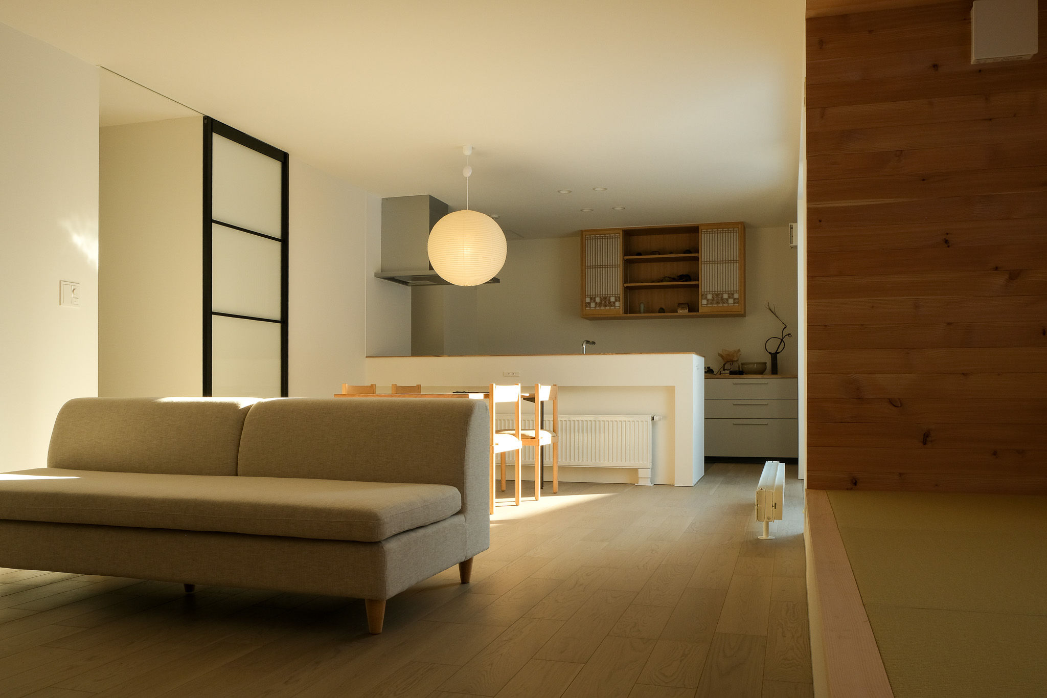 Re:Knot の大きな魅力のひとつは、本格的な和のテイストを住まいに取り入れられることです。既存の建物には、趣のある質感が印象的に残っていました。その雰囲気を活かしつつ、新しい住まいのかたちへと再定義されています。リビング横に設けた畳の質感を楽しめる小上がりスペース。座ってくつろいだり、ちょっと一息つくのにぴったりの場所です。自然素材ならではの木の温もりも随所に感じられ、和のテイストを取り入れながらも、心地よさを大切にした空間づくりを実現しています。