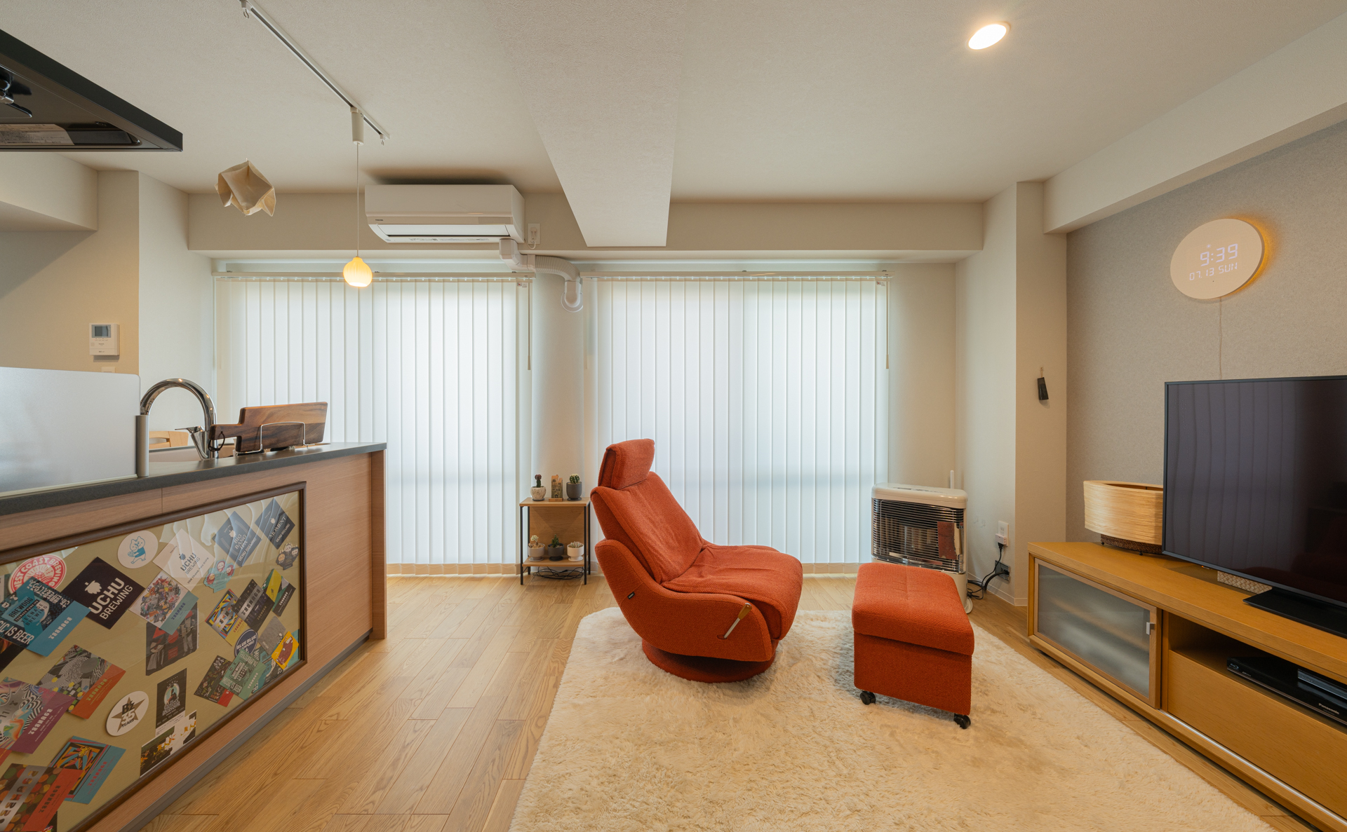 「しまう」だけでなく「飾る」ことを前提にした、趣味をむき出しに楽しむ土間空間。躯体あらわし×コンクリート×アイアンで仕上げたインダストリアルなゾーンと、ナチュラルなLDKゾーンをつなぐことで、趣味と日常のバランスを両立しました。限られた53㎡を活かし、1LDKながらも開放感とメリハリのある住まいを実現。