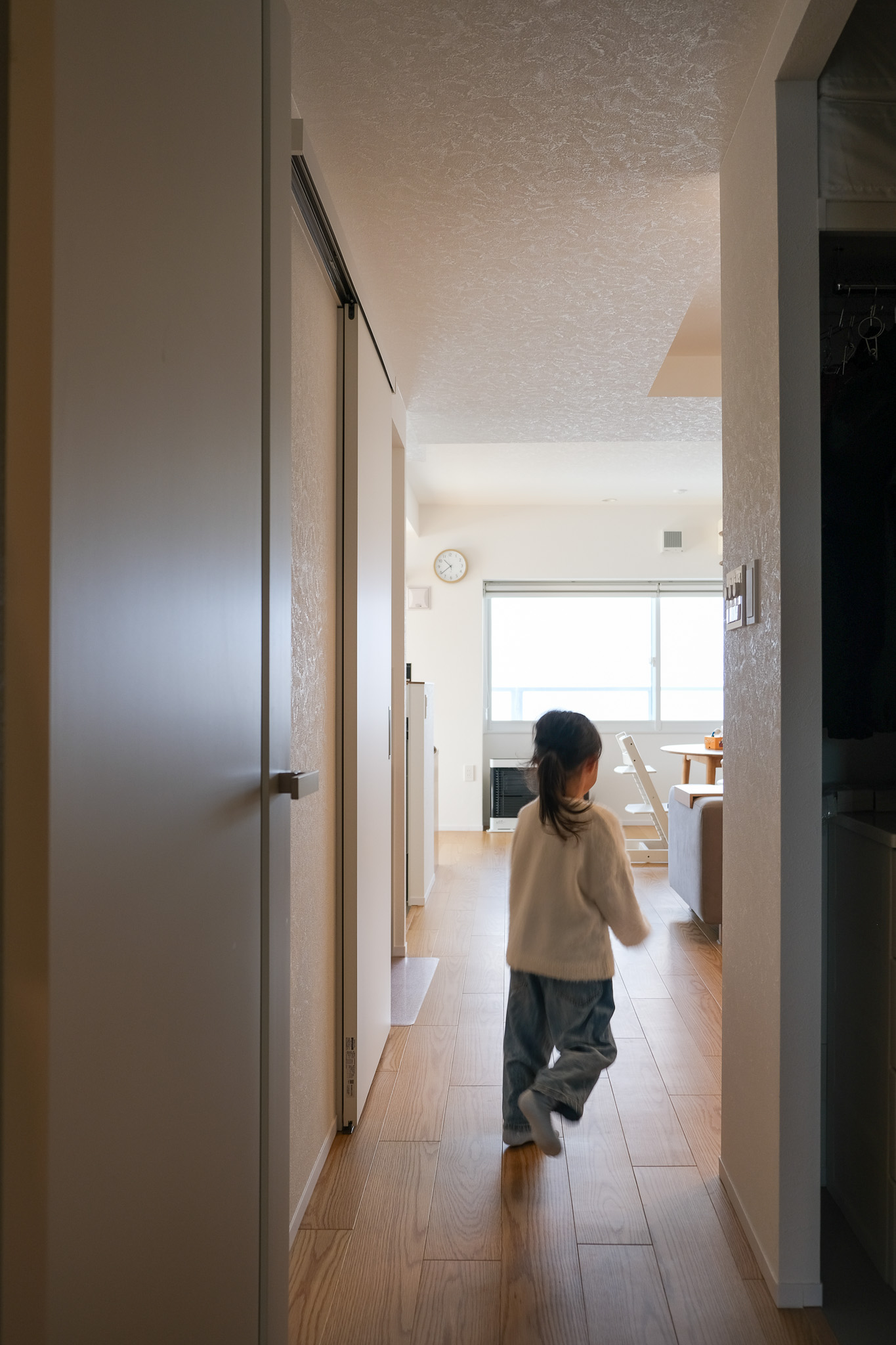 玄関には有孔ボードをはじめ、壁を有効活用する工夫を随所に取り入れ、ご家族の使いやすさを大切にしました。89㎡のゆとりを活かしきった、「生活のしやすさ」と「遊び心」が心地よく共存するリノベーション実例です。