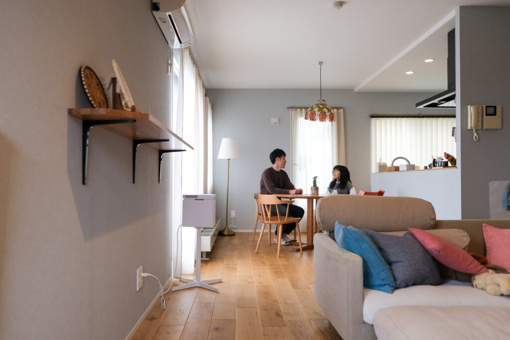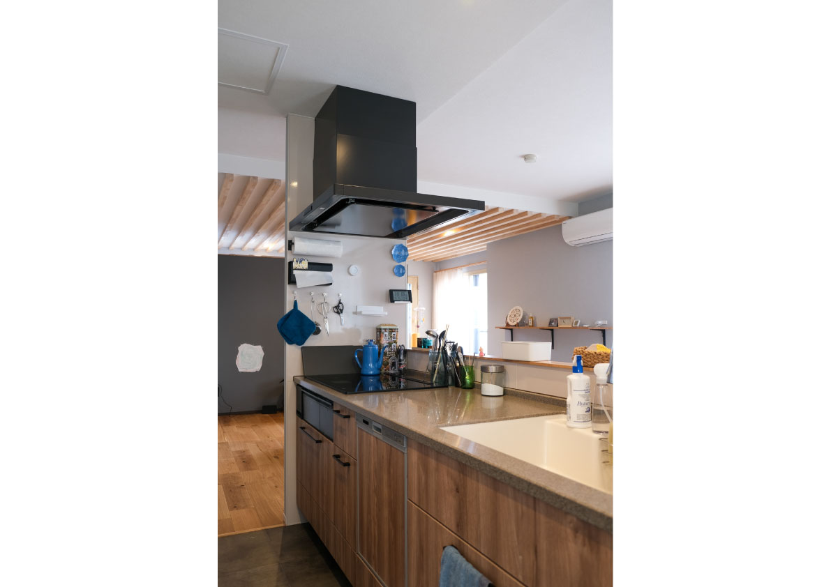 テレビ背面には腰壁を設け、その裏にリビング収納を確保。さらにキッチンはペニンシュラ型とし、住まい全体を回遊しやすい間取りへ。家族それぞれの時間を大切にしながら、自然とつながりを感じられる住まいです。