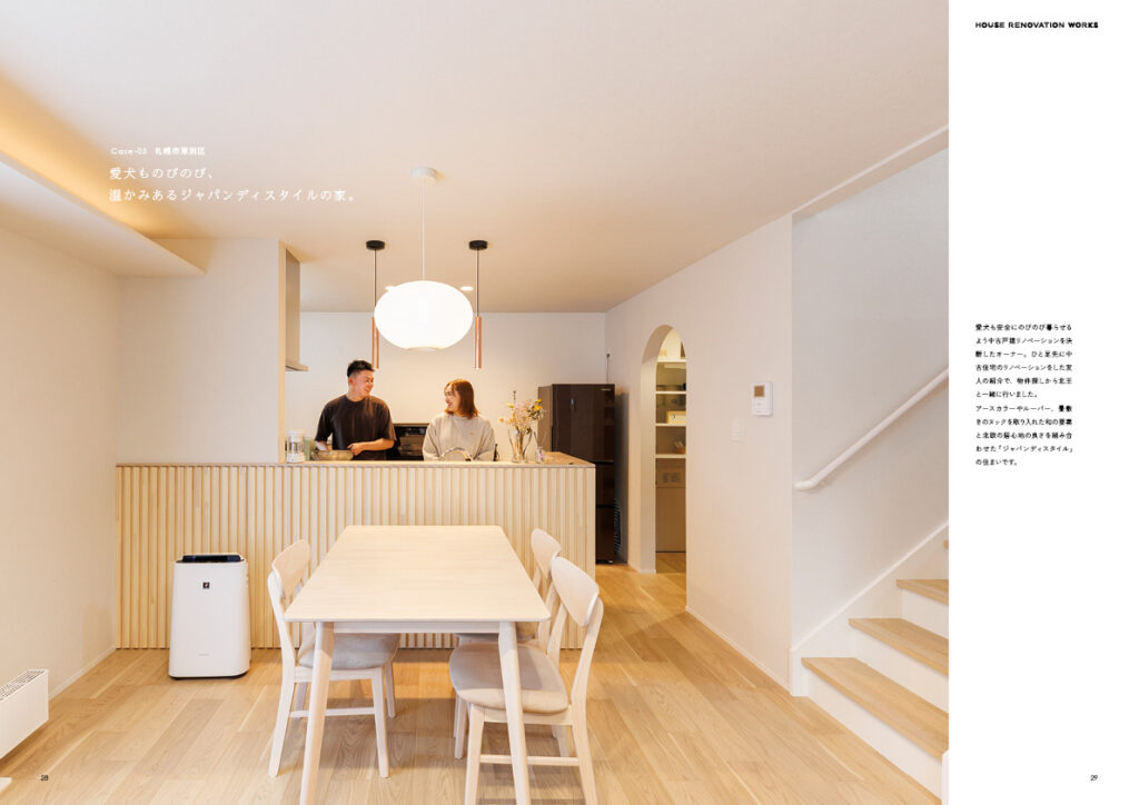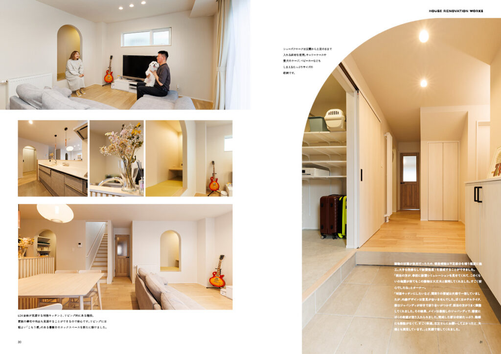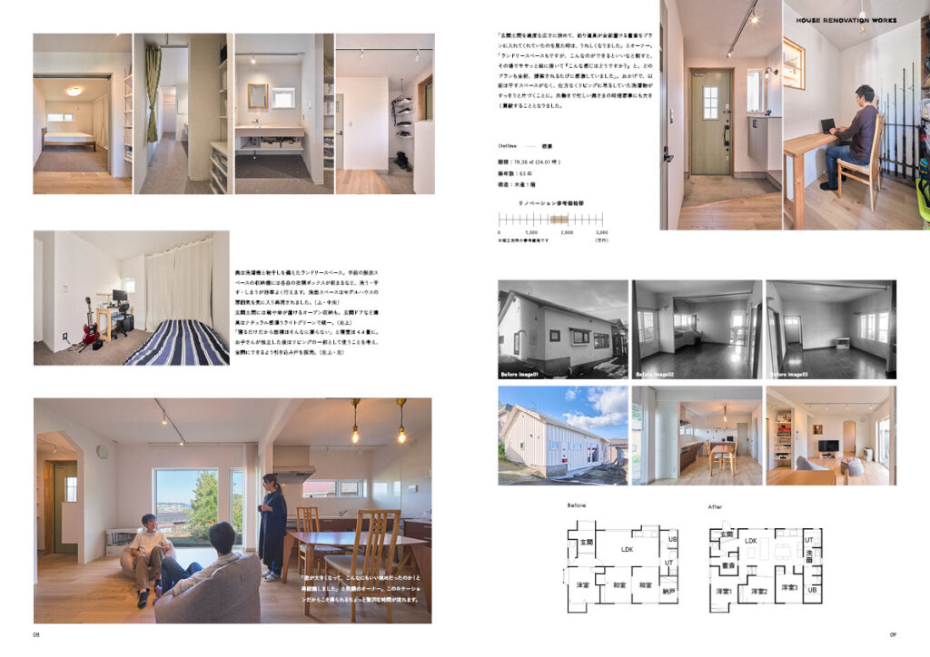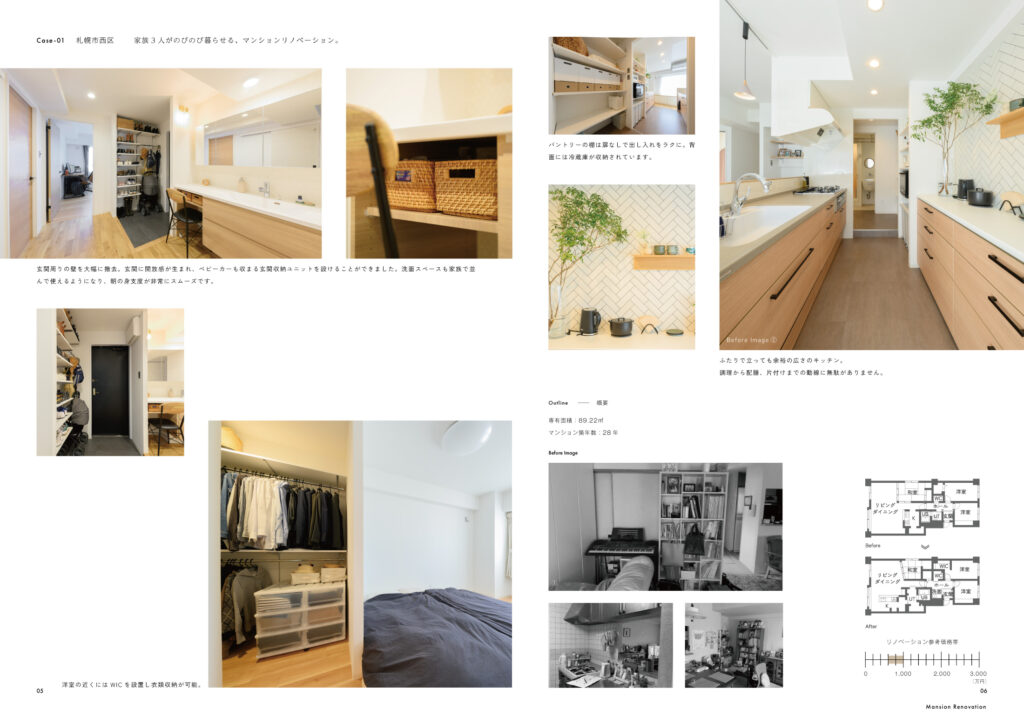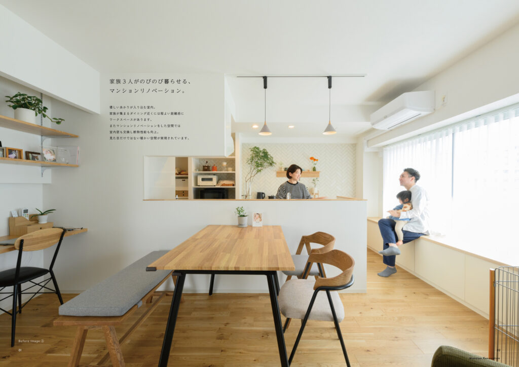 施工実例の中身は施工前のBefore写真と施工後のAfter写真をはじめ、間取図やリノベーションの費用もご紹介しています。昨今、注目を集めている戸建て・マンションリノベーションのイメージを手にとって感じて頂けたら嬉しいです。